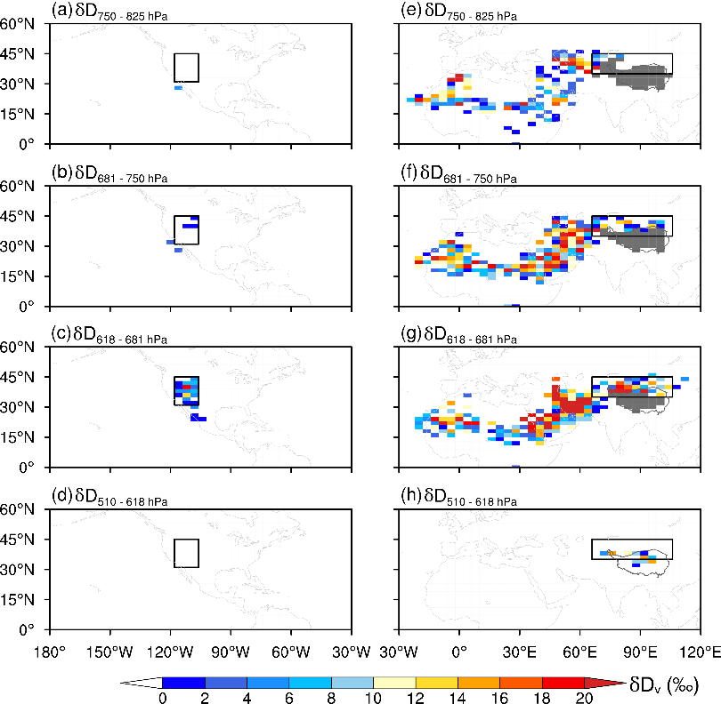 △夏季美国西部和亚洲干旱区不同层水汽稳定同位素的“反高程效应”的空间分布格局
