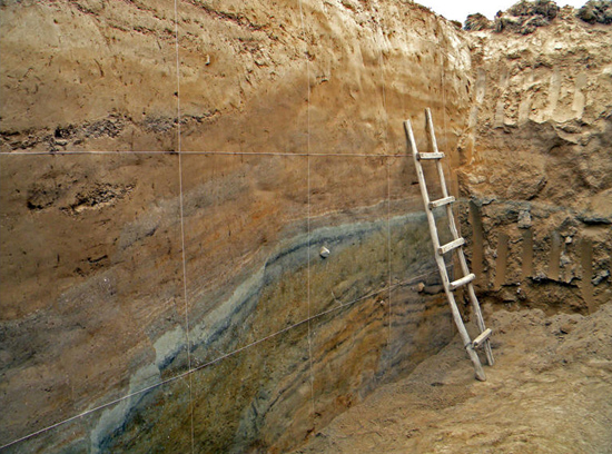 图2 野外工作包括对探槽两壁进行多次仔细清理,分析揭示的地层和古地震事件,并拍录