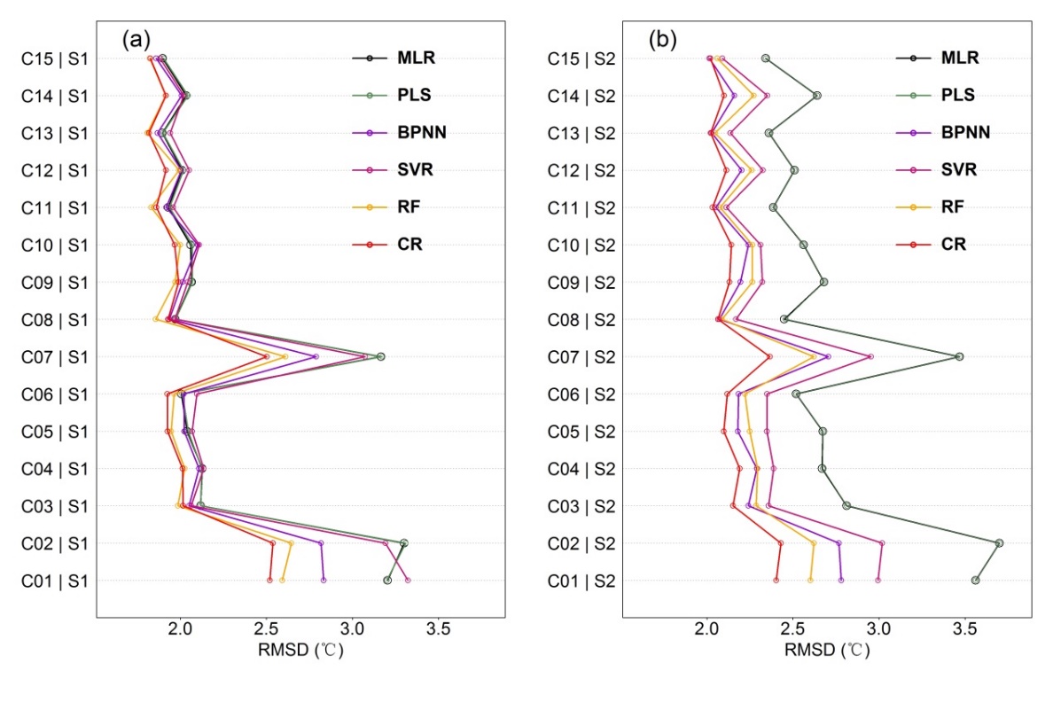 图1. 六种统计模型在不同地温组合和数据质量条件下的估算性能比较:高质量(a)和高低质量混合(b)