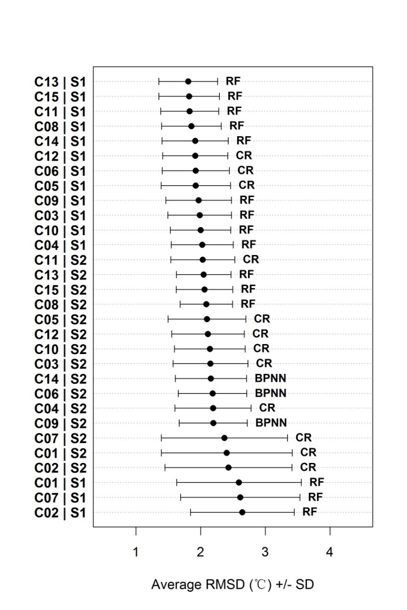 基于对以上问题的考虑,中国科学院青藏高原地球科学卓越创新中心、青藏高原研究所张凡研究员课题组张宏波博士及其合作者提出了一种动态整合MODIS地温数据、自动选择最优统计模型的气温估算方法。与传统的单一模型方法相比,新方法对所有15种可能的地温组合依次建立统计模型,实现了气温估算产品的云量最小化;选取包括多元线性回归(MLR)、偏最小二乘(PLR)、反向传输神经网络(BPNN)、支持向量回归(SVR)、随机森林(RF)和Cubis回归(CR)等在内的6种统计模型为待选模型,在每种地温组合条件下进行比较,通过交叉验证选出最优模型;并考虑了两种地温数据质量条件,从而生成了2*15=30个估算模型。在实际估算气温时,使用新方法根据实际数据条件逐日、逐网格地选用最优模型进行气温估算,生成了2003至2010年青藏高原1公里空间分辨率的日平均气温产品,将云遮挡造成的数据缺失率从单一地温产品的35-54%降低到目前气温产品的14%。