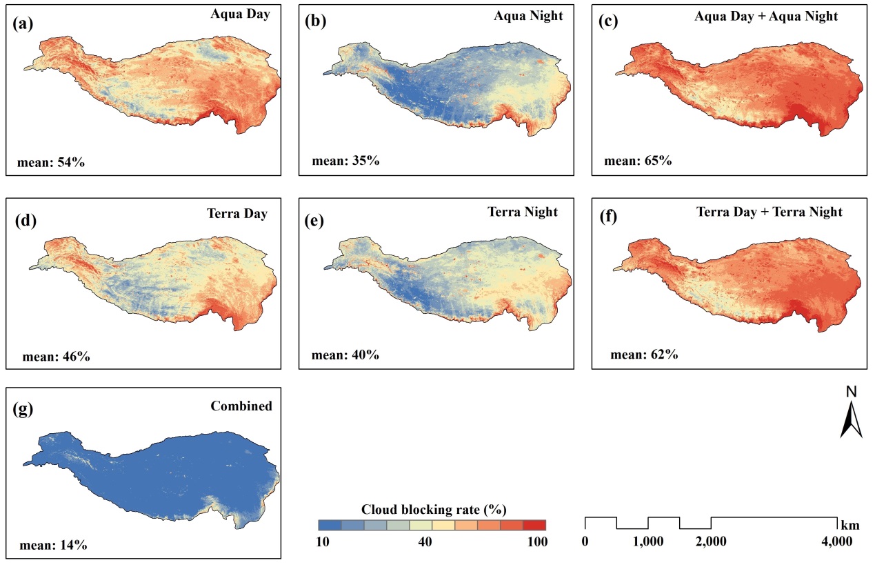 图3. 使用新方法生成的气温产品的云覆盖率与单一地温或地温组合的效果对比