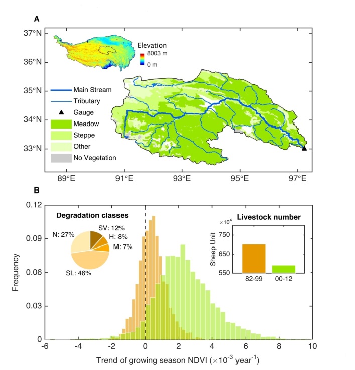 三江源区地处青藏高原腹地,其重要生态屏障功能之一是为中下游提供稳定优质的水资源。然而,受到人类活动和气候变化的共同作用,三江源尤其是长江源地区草地呈严重退化趋势。为恢复草地生态功能,我国政府自本世纪初以来开始实施三江源区生态保护和建设工程,主要包括退牧还草和黑土滩治理等项目。近几年来,大量工作主要围绕生态工程实施以来草地恢复态势方面开展,针对工程对长江源区水资源影响的系统性研究鲜有报道。