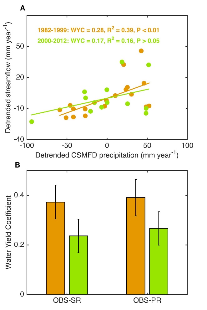 基于此,中国科学院青藏高原研究所,青藏高原地球科学卓越创新中心汪涛研究员课题组(博士后李佳和刘丹为本研究的共同第一作者),联合中国科学院西北高原生物研究所和澳大利亚CSIRO Land & Water等单位研究人员,根据长江源直门达水文站径流观测,结合气象和卫星遥感资料,发现草地生态工程(Figure 1)导致了丰水期产流系数的显著降低(Figure 2)。通过进一步利用高寒草地生态系统长期围栏封育试验、Budyko水热耦合平衡理论和区域水汽再循环模型WAM-2layers,量化分析了草地生态工程和气候变化对长江源区关键水文过程变化(径流、蒸散发和土壤水源涵养能力)的影响(Figure 3)。结果显示:草地生态工程显著促进了地表蒸散发过程,起到了减少丰水期径流的作用,其减少量约占丰水期平均径流量的16.4%;其次,通过本地蒸散发再循环过程,草地生态工程有利于区域降水的形成,进而增加径流,但其增加量不足以弥补蒸散发增强引起的径流减少;再者,不同于过去干旱和半干旱地区的造林工程,草地生态工程提高了土壤水源涵养能力,这一结论得到站点水平长期围栏封育试验的证实;最后,值得注意的是,草地生态工程实施以来,大气环流变化引起了降水增强,从而增加了径流量,抵消了由生态工程导致的径流减少,因此长江源直门达水文站观测的径流量仍然表现为增加趋势。