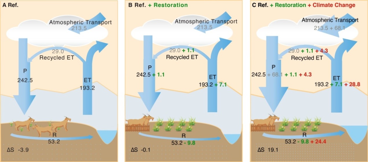 图3. 草地生态工程和气候变化对长江源区主要水文过程的影响