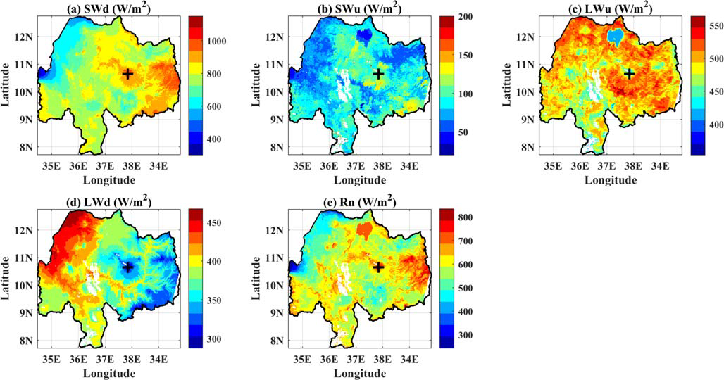 利用站点气象数据和卫星遥感手段得到的青尼罗河上游的地表辐射四分量及净辐射的空间分布图