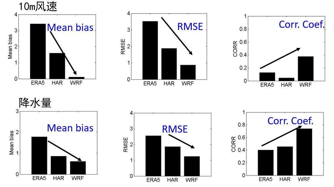 图1 ERA5、HAR和高分辨率WRF模拟的10-m风速(;m/s;上)和降水(mm/day;下)相对于站点的平均偏差、均方根误差以及模拟值和观测值空间分布的相关性