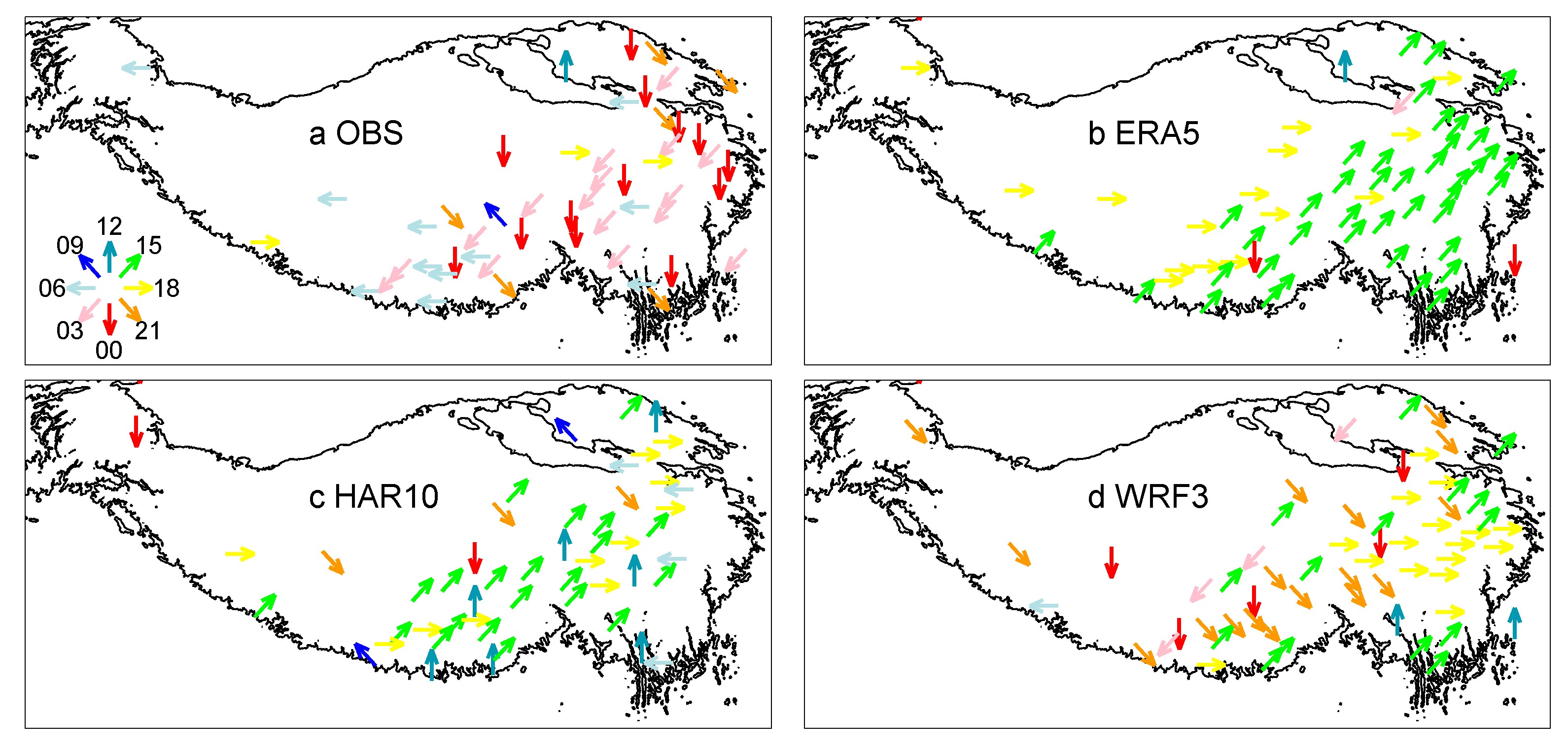 图2 站点观测数据、ERA5、HAR和WRF高分辨率模拟中降水日变化峰值出现的时刻(图例中箭头指向数字表示地方时)