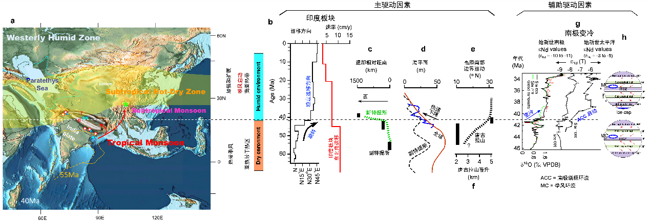 通过开展晚始新世青藏高原的构造演化与古地理格局的集成研究(图3),约4100万年前印度板块漂移速率急剧下降和俯冲型洋壳熔融岩浆活动结束等可能指示印度板块与亚洲板块全面碰撞,导致此时新特提斯海快速关闭、副特提斯海急剧后退、青藏高原南界快速北移和中部唐古拉山地区快速抬升,耦合全球海平面快速下降和南极降温,共同导致了亚洲陆地面积急速扩大,强化了海陆热力对比,可能导致热带印度季风在约4100万年前显著增强,快速从南亚热带地区向北扩展进入亚热带云南地区。
