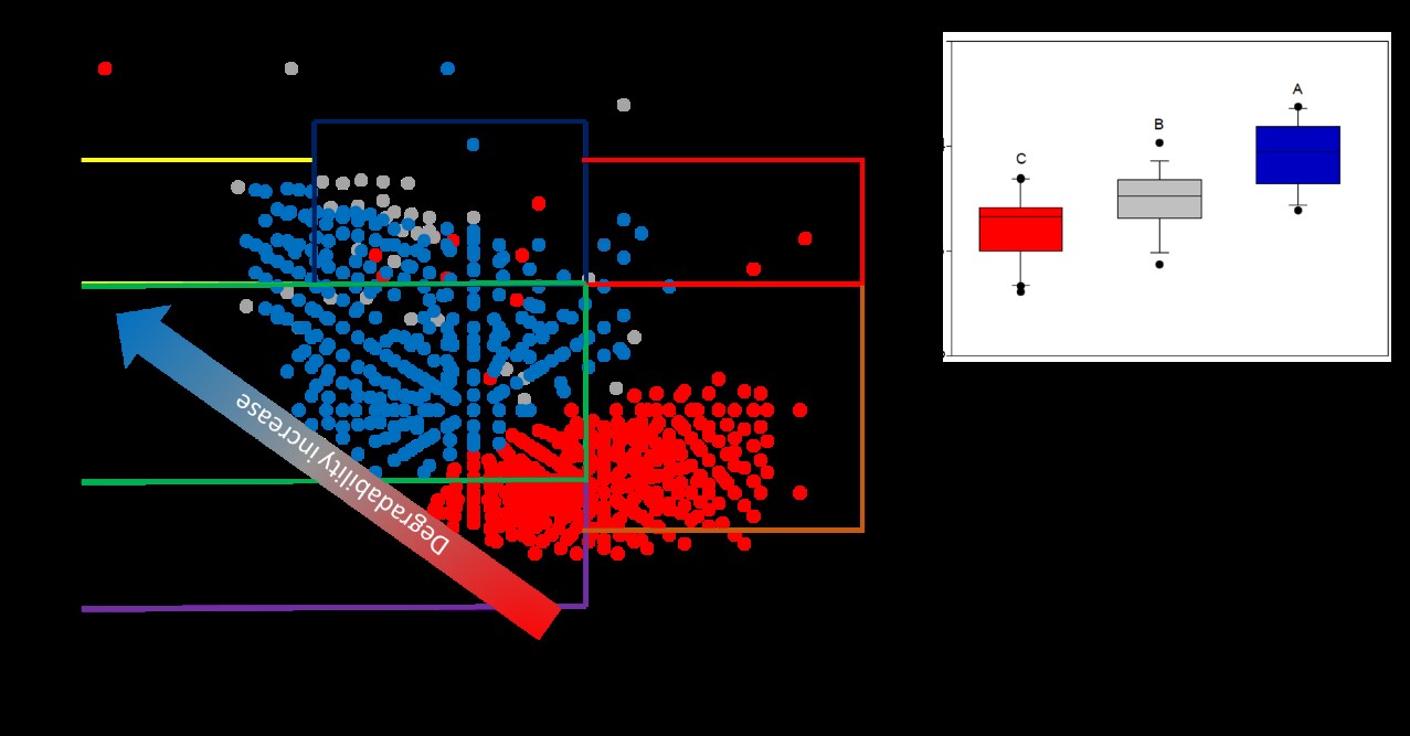 为此,中科院青藏高原研究所生态系统功能与全球变化团队孔维栋研究员等沿青藏高原干旱区降水梯度带采集了草地土壤样品,涵盖高寒草甸、草原和荒漠三种草地类型,系统研究了土壤溶解性有机质分子组成分布特征及其微生物转化机制,解析了干旱区草地生态系统土壤储碳机制。研究结果显示,随着草甸-草原-荒漠过渡,土壤总有机碳含量逐渐降低,但其溶解性有机质可降解性显著增加,有机质分子组成从难降解性向易降解性变化(图1)。微生物量碳与总有机碳比值与溶解性有机质可降解性指数呈显著正相关(图2),说明土壤溶解性有机质可降解性增加会促进微生物生长,加速微生物降解土壤总有机质。利用结构方程模型,研究人员进一步发现,土壤溶解性有机质可降解性主要受土壤碳氮含量驱动。进一步通过分子水平研究,发现土壤溶解性有机质可降解性及微生物过程是驱动干旱区土壤储碳的重要因素,可为干旱区土壤储碳及实现“碳达峰、碳中和”目标提供理论基础。