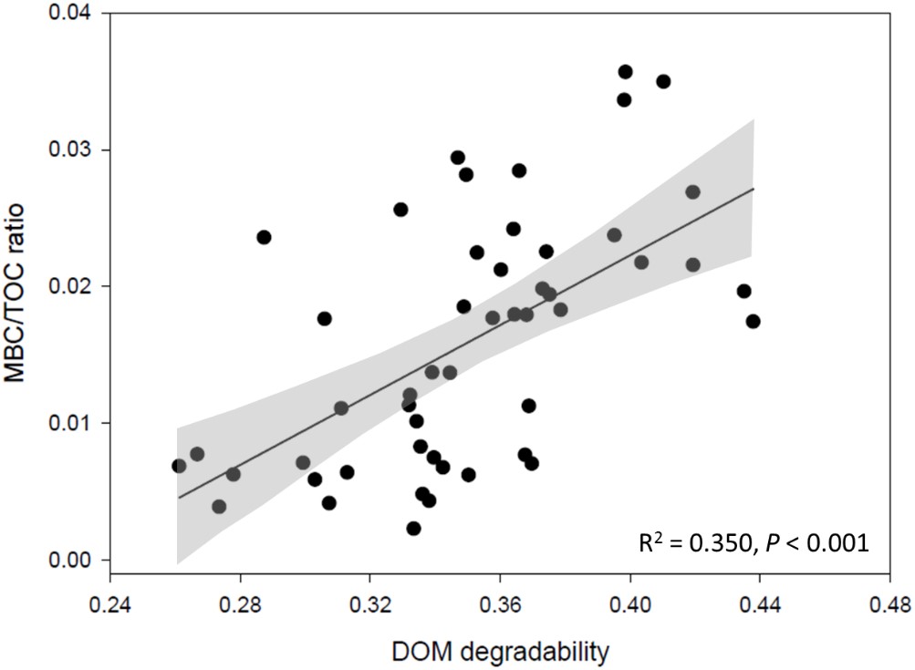 图2 微生物量碳与总有机碳比值与DOM可降解性指数显著相关