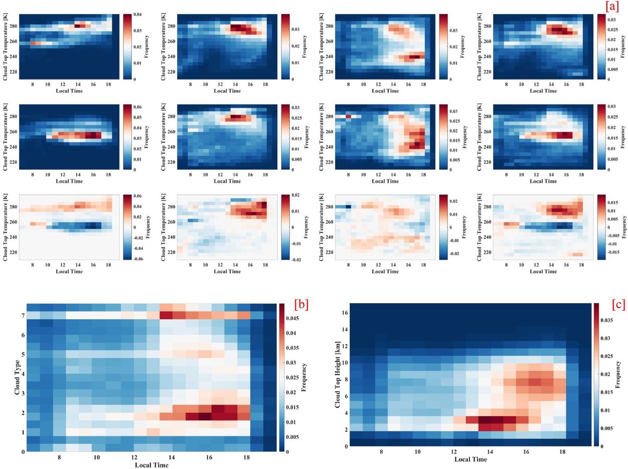 图a为云顶温度的分布。其中第一行是早上EF>0.65事件的平均云频率。第二行是早上EF<0.50事件的平均云频率。第三行是EF>0.65和EF<0.5之间的云频率变化。从左到右依次为浅对流、对流发展、深对流和降水四种情况。图b为云类型的分布(ISCCP)。图c为云顶高度(CTH)的分布。