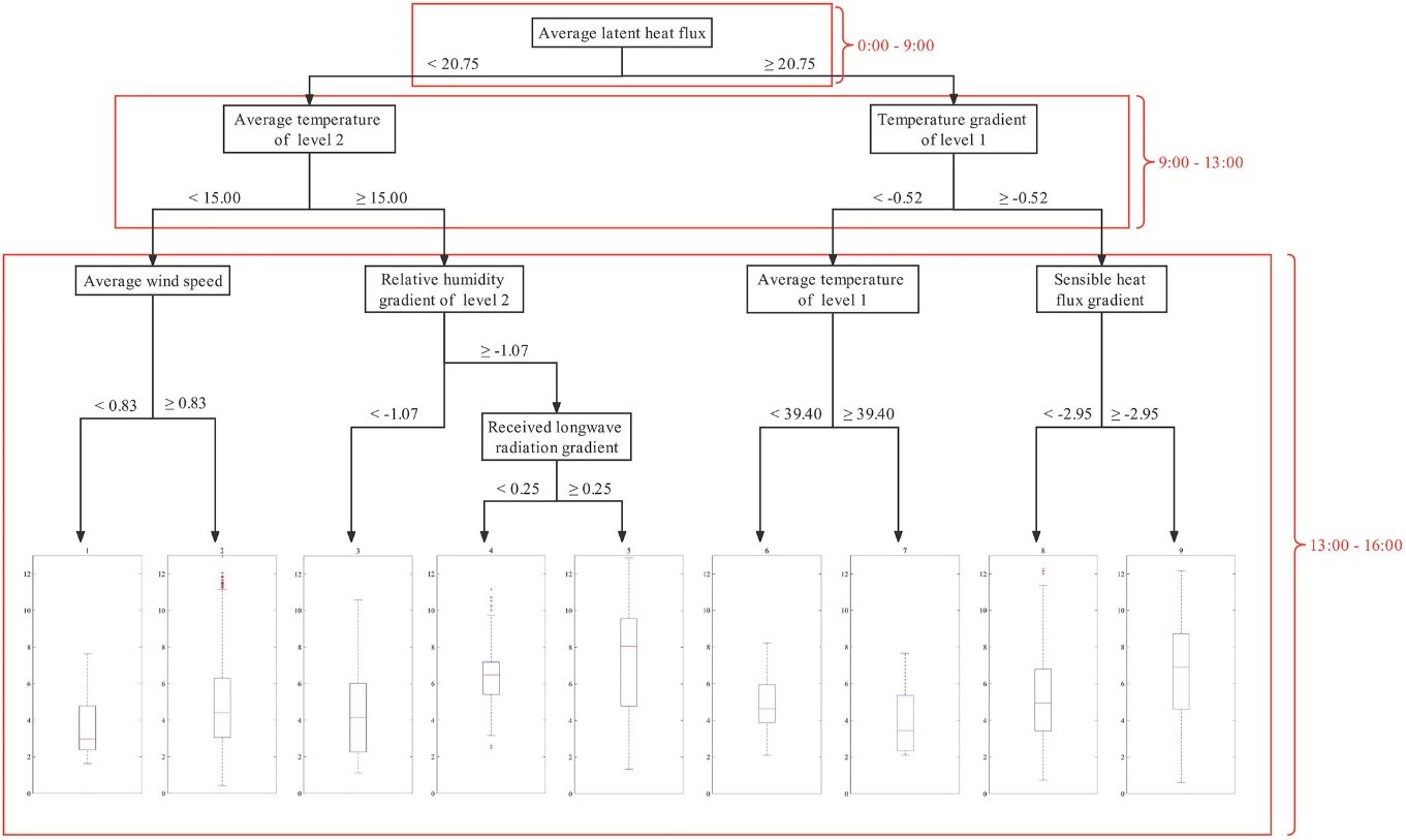 图3 利用观测站提供的近地表气象数据和Himawari-8提供的云顶温度(CTT)建立的一个能够代表时间过程的复合回归树。每次分支仅由该时间段中变量的平均值或梯度确定。底部一行的箱须图显示了每个节点中蒸发比(EF)的分布。在每个箱体上,中心标记表示中间值,箱体的底部和顶部边缘分别表示25%和75%值。虚线延伸到最远的非离群数据点,离群值用“+”单独绘制。