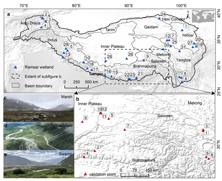 图1 研究区a. 黑线为青藏高原及流域边界,蓝色三角形是典型的拉姆萨尔湿地位置;b.为子图a.虚线矩形框的放大视图,红色三角形表示无人机野外获取点位数据;c-e.是沼泽、洪泛平原和沼泽湿地的实地照片