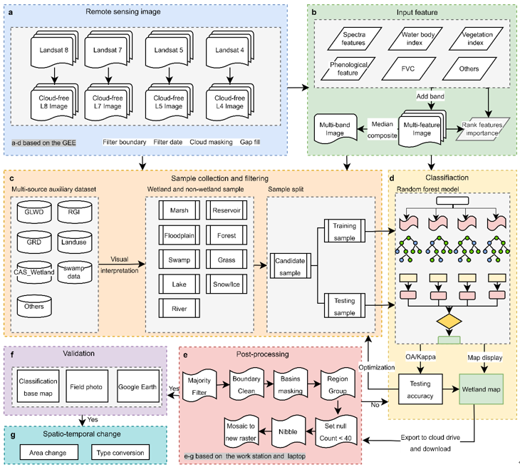图2 湿地分类与面积变化研究技术路线a-d.湿地分类过程;灰色框表示遥感影像、分类特征、多源辅助数据、样本数据集和随机森林分类原理示意图;e-f.分类后处理和验证;g.通过分析面积变化和类型转换来分析湿地面积时空变化