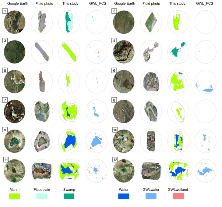 图3 本研究湿地分类图与谷歌地球高清影像、野外实地无人机高分辨率影像和GWL_FCS 湿地产品对比