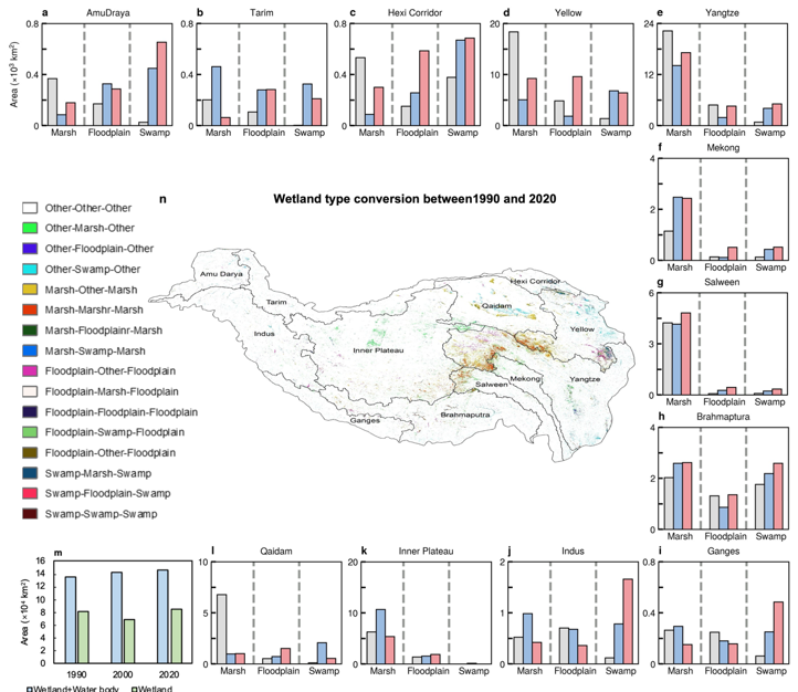 a-l. 分别为1990、2000和2020年青藏高原12个流域三种类型湿地的面积直方图,分别以灰色、红色和蓝色表示草本沼泽、洪泛湿地、木本沼泽;m.是包含及排除水体两种情况下的湿地总面积;n.为1990~2020年间的湿地面积类型转换