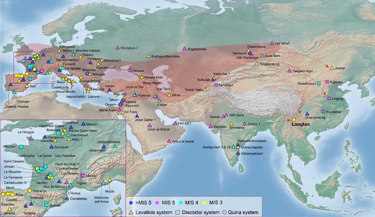 图1. 欧亚大陆旧石器时代中期不同技术类型遗址分布图。三角形代表勒瓦娄哇技术类型遗址、方形代表盘状技术类型遗址、圆形代表基纳技术类型遗址;图形内不同填充颜色,指示不同年代(以最早出现年代为准),蓝色指示年代在MIS 5阶段之前(大于距今约13万年),红色指示年代在MIS 5阶段(距今约13-7万年),绿色指示年代在MIS 4阶段(距今约7-5.7万年),黄色指示年代在MIS 3阶段(距今约5.7-3万年)。