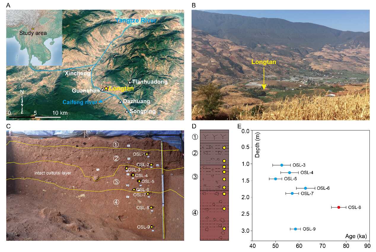 图2. 龙潭遗址地理位置、地貌、地层与年代。(A)龙潭遗址及周边其他调查发现遗址的位置图;(B)龙潭遗址所在区域地貌景观;(C)探方东壁地层剖面及光释光采样位置;(D)地层剖面和年代样品位置示意图;(E)光释光测年结果。