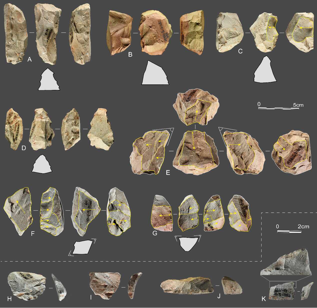 图3. 龙潭遗址基纳技术石制品。(A-D)基纳刮削器;(E-G)基纳石核;(H-J)再修理石片;(K)以再修理石片为毛坯制成的小型工具。