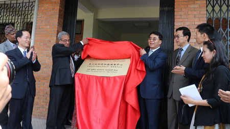参观结束前,白春礼院长和希拉教授共同为第三极环境加德满都中心正式揭牌并合影留念。中国驻尼泊尔大使吴春太陪同参加访问。