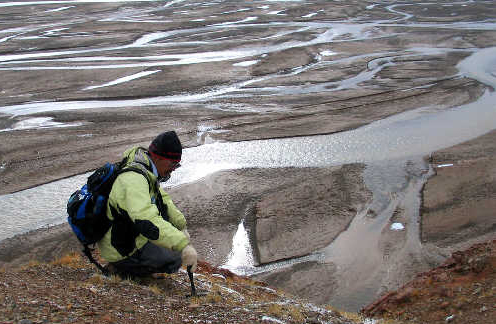 中科院南京地质古生物研究所副研究员、科考队员李建国在黑石河边山崖考察古生物化石(