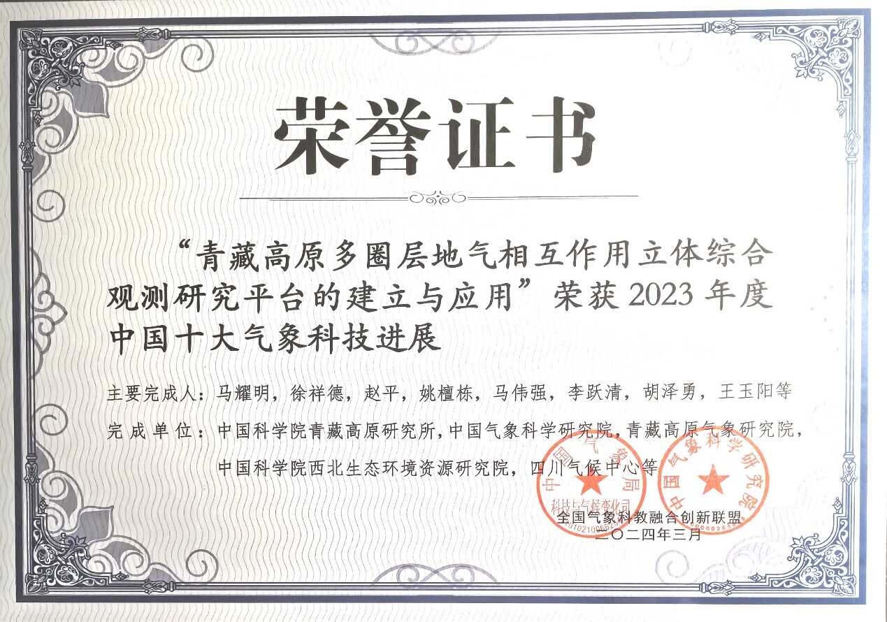 3月28日,2023年度中国十大气象科技进展获奖项目在南京揭晓,中国科学院青藏高原研究所联合中国气象科学研究院、青藏高原气象研究院和中国科学院西北生态环境资源研究院等单位完成的“青藏高原多圈层地气相互作用立体综合观测研究平台的建立与应用”荣获全国十大气象科技进展,我所马耀明研究员代表项目团队领奖。