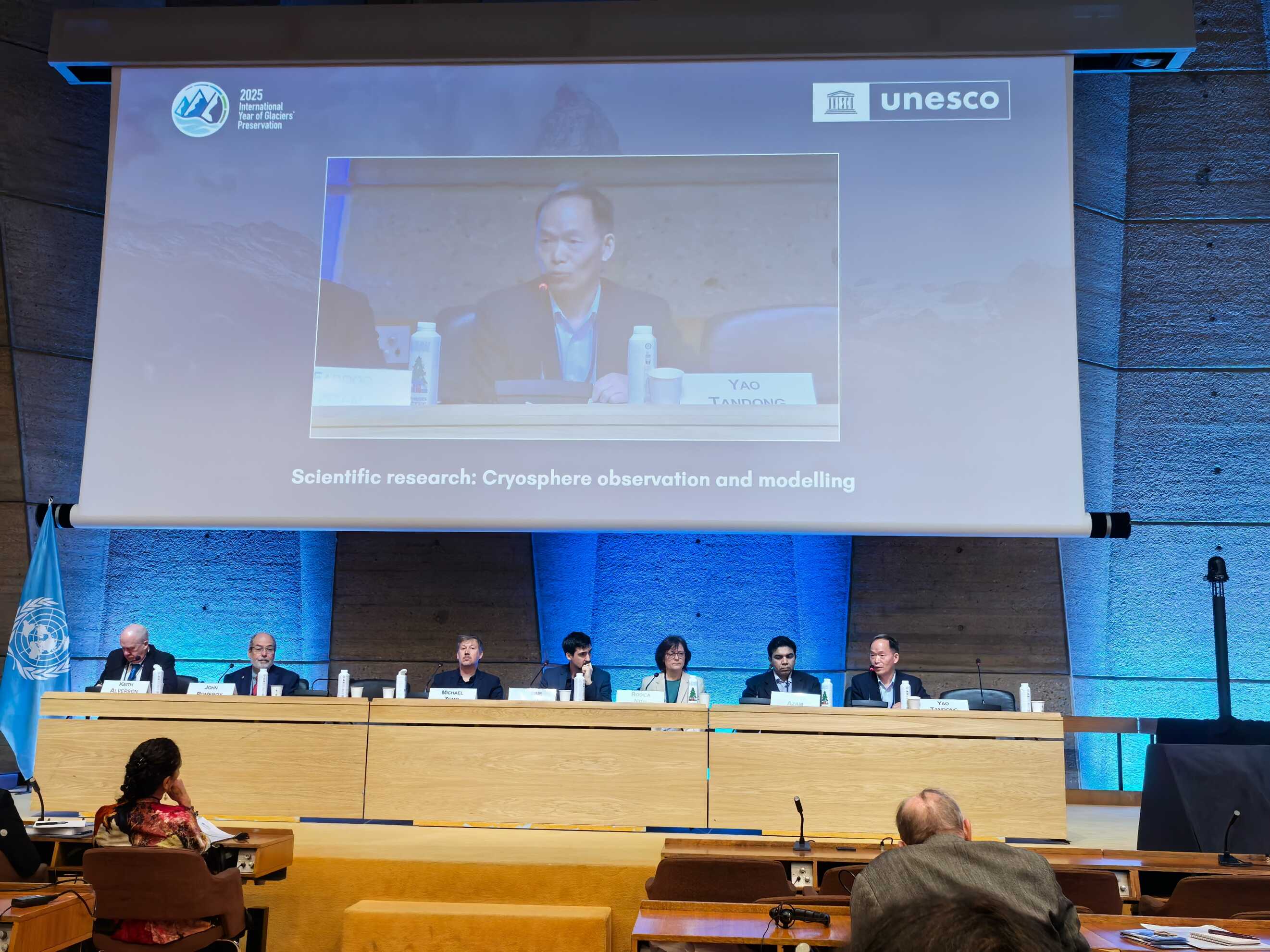同时,第二次青藏科考在联合国首个世界冰川日活动中组织了“亚洲水塔冰川融化的地球系统响应过程(TPGE)”边会。边会上,姚檀栋院士、Lonnie Thompson院士(美国科学院院士、中国科学院外籍院士、中华人民共和国国际科技合作奖获得者)、陈德亮院士(瑞典皇家科学院院士、中国科学院外籍院士、中华人民共和国国际科技合作奖获得者)、Walter Immerzeel教授(荷兰乌特勒支大学、国际冰川和水文学顶尖专家)、以及区域青年科学家先后做了报告,分享了亚洲水塔冰川与发展的最新研究进展,强调了应对冰川融化的必要性和紧迫性。边会还着重讨论了联合行动方案,包括建立地球系统科考平台和AI建模融合,深入研究冰川动态过程及其对气候变化、水资源和生态系统的影响;开展标志性遗产冰川保护试验,建立冰川资源库,存储冰芯和冰川生物资源;监测冰崩、冰湖溃决等冰冻圈灾害,服务防灾减灾,支撑青藏高原及全球可持续发展等。